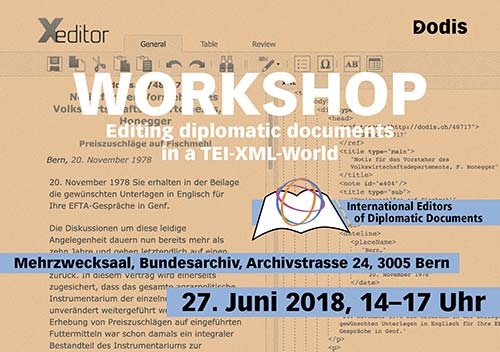 Im Rahmen des weltweit ersten Scholarly Exchange Program des International Committee of Editors of Diplomatic Documents (ICEDD) fand am 27. Juni 2018 ein Workshop zum Thema «Editing Diplomatic Documents in a TEI-XML World» statt. Nach der Einleitung durch Prof. Dr. Sacha Zala diskutierten Dr. Joe Wicentowski (Foreign Relations of the United States, FRUS), Dr. Christiane Sibille und Wolfgang Meier (eXist Solutions) Entwicklungen und Perspektiven für die Arbeit mit TEI-XML und stellten die Software TEI Publisher vor.