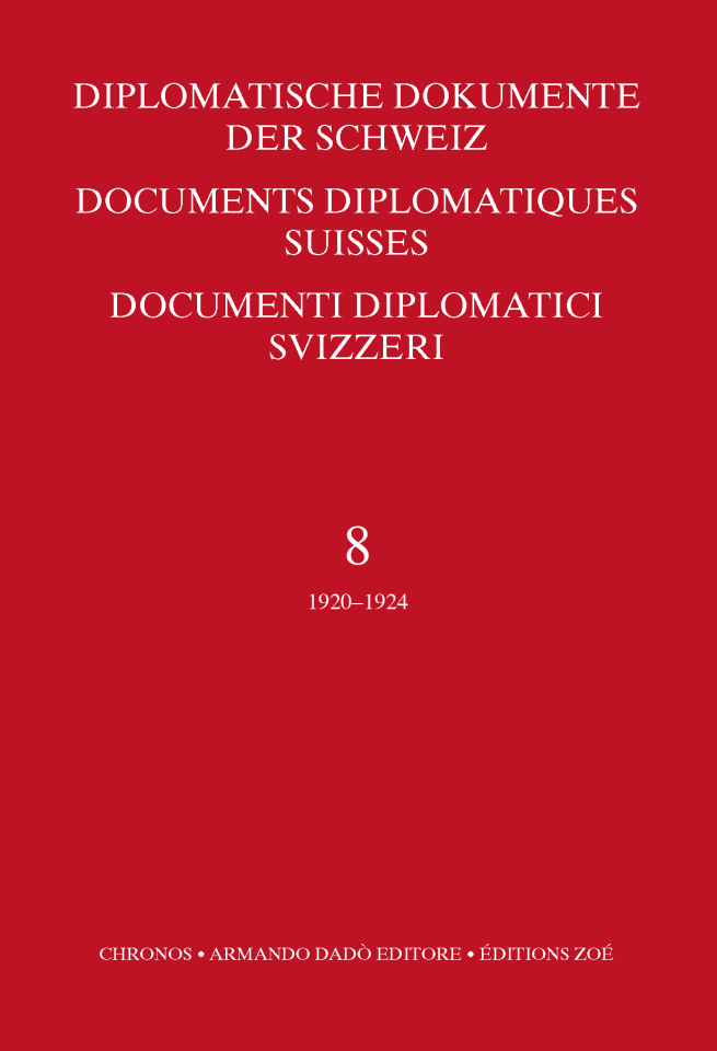Print Edition DDS, vol. 8 (1920–1924) ISBN 3-7165-0609-5 Diplomatic Documents of Switzerland Volume 8 (1920–1924) edited by the Commission Office bound, with dust cover, 16x24cm, 1988. XCVI and 1'042 pages. CHF 150.– pdf Documents in Dodis Documents in Dodis ISBN 3-7165-0609-5