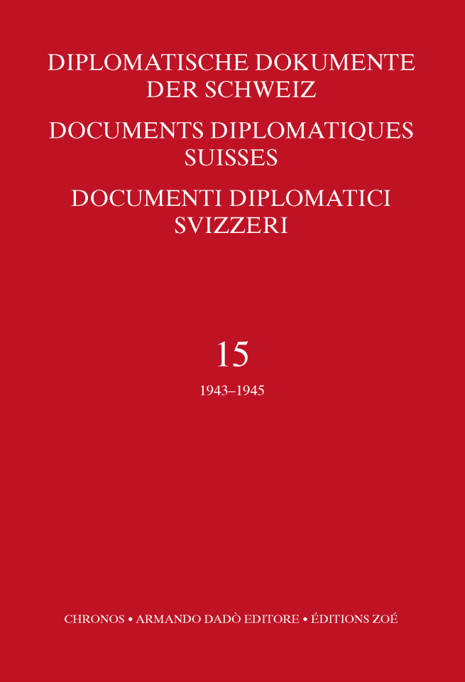 Edition DDS, vol. 15 (1943–1945) ISBN 3-7165-0843-8 Documents Diplomatiques Suisses Volume 15 (1943–1945) sous la direction des Prof. L.-E. Roulet et Ph. Marguerat, Université de Neuchâtel relié, avec couvre-livre, 16x24cm, 1992. CVIII et 1'200 pages. CHF 160.– pdf Documents dans Dodis Documents dans Dodis ISBN 3-7165-0843-8