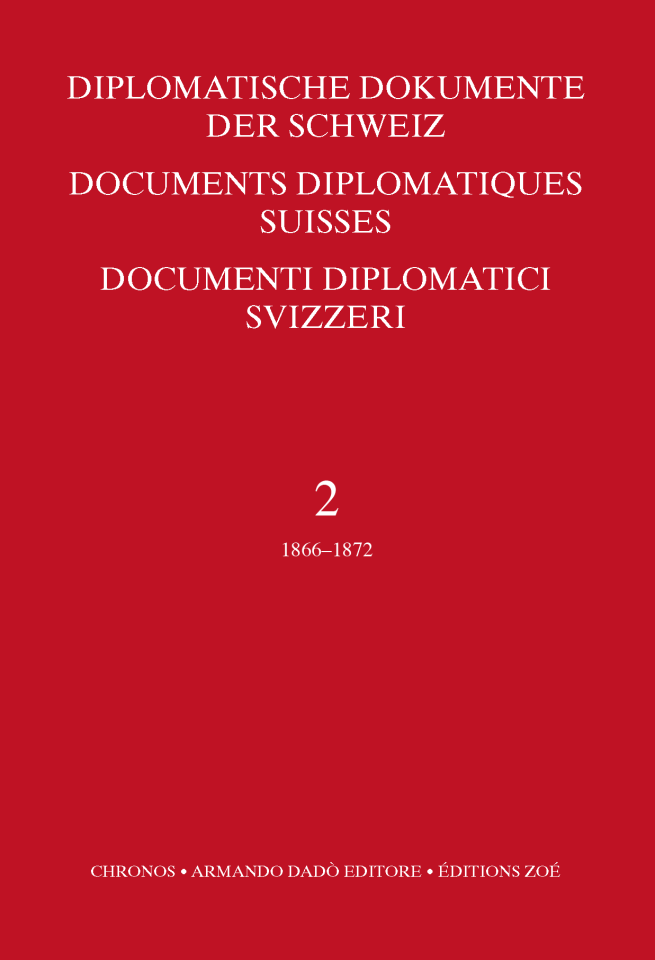 Edition DDS, vol. 2 (1866–1872) ISBN 3-7165-0496-3 Documents Diplomatiques Suisses Volume 2 (1866–1872) sous la direction du Prof. R. Ruffieux, Université de Fribourg relié, avec couvre-livre, 16x24cm, 1985. LXXX et 760 pages. CHF 150.– pdf Documents dans Dodis Documents dans Dodis ISBN 3-7165-0496-3